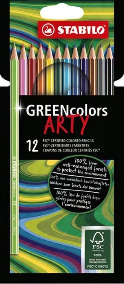 STABILO potloden Geef de kleurplaten (en al je andere kunstwerken) kleur met deze gekleurde potloden van het bekende merk STABILO. In de verpakking vind je 12 verschillende kleuren potloden Speciaal ontwikkeld potlood, gemaakt van 100% FSC-gecertificeerd hout. Zeskantige potloodvorm met witte strepen en milieuvriendelijke matte coating. Kwalitatieve kern met intense kleurafgifte Kleuren: de tinten 550 geel groen, 350 roze, 310 rood, 221 oranje, 205 geel, 520 loof groen, 455 lucht blauw, 420, 385 paars, 655 licht bruin, 726 grijs, 750 zwart. Trefwoorden STABILO GREENcolors | STABILO | Kleurpotloden voor volwassenen | 12 STABILO kleurpotloden | Zeskantige potloden | 100% FSC® | Potloden volwassenen | Tekenen | Stiften | Tekenen voor volwassenen | Potloden volwassenen | Duurzaam