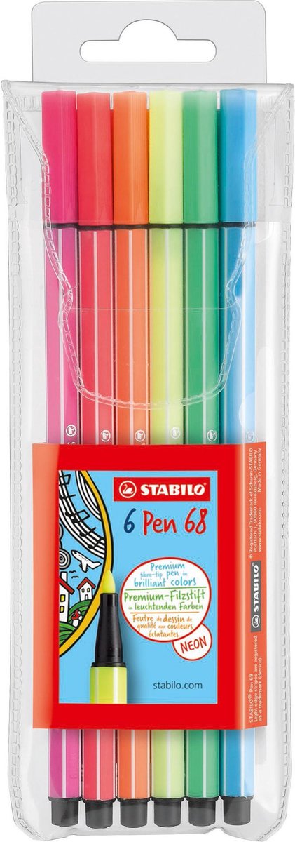 Hoge kwaliteit viltstift met intense kleuren. Inhoud etui 6 neon kleuren van de Pen 68 viltstift. Voor lijnen en grote vlakken. Robuuste ronde punt, schrijfbreedte ca. 1 mm. Drukbestendige punt. Geurloze inkt op waterbasis. Geventileerde dop. Kan tot 24 uur zonder dop, zonder uit te drogen