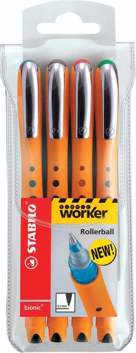 Stabilo roller Bionic Worker etui van 4 stuks (blauw, rood, groen en zwart) Schrijfbreedte: 0,5 mm, medium punt. Elegant en geraffineerd design. Ergonomische, soepele en aangename grip. Oranje lichaam. Niet-navulbaar.