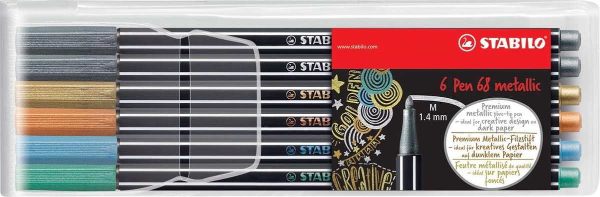 Viltstiften van zeer hoge kwaliteit in prachtige metallic kleuren. Schrijft direct, schudden of pompen is niet nodig. Opvallende effecten, vooral op donkere ondergronden een groots resultaat! Zeer goede kleurafgifte dankzij de dikke punt van 1,4 mm. Schrijft ook op gladde oppervlakken als folie, wenskaarten of cadeaupapier. Inkt op waterbasis, in hoge mate lichtecht voor een langdurende metallic kleurintensiteit. Metallic producten altijd liggend bewaren. Geschikt vanaf 14 jaar.