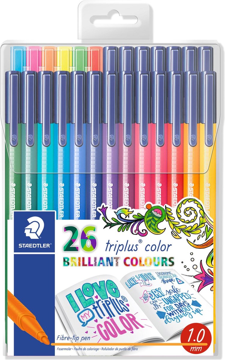 STAEDTLER triplus color - Driekantige viltstift - Johanna Basford Kartonnen etui met 26 briljante kleuren (20 + 6 gratis) Speciale Johanna Basford editie Ergonomische, driekantige viltstift om ontspannen en zacht te schrijven en te kleuren Stabiele, drukbestendige punt Geventileerde dop, conform aan ISO 11540 en BS 7272-1/2 DRY SAFE - kan dagenlang open liggen zonder uitdrogen (Test ISO 554) Inkt op waterbasis Uitwasbaar uit de meeste textielsoorten PP lichaam en dop voor een lange levensduur Lijnbreedte ca. 1,0 mm