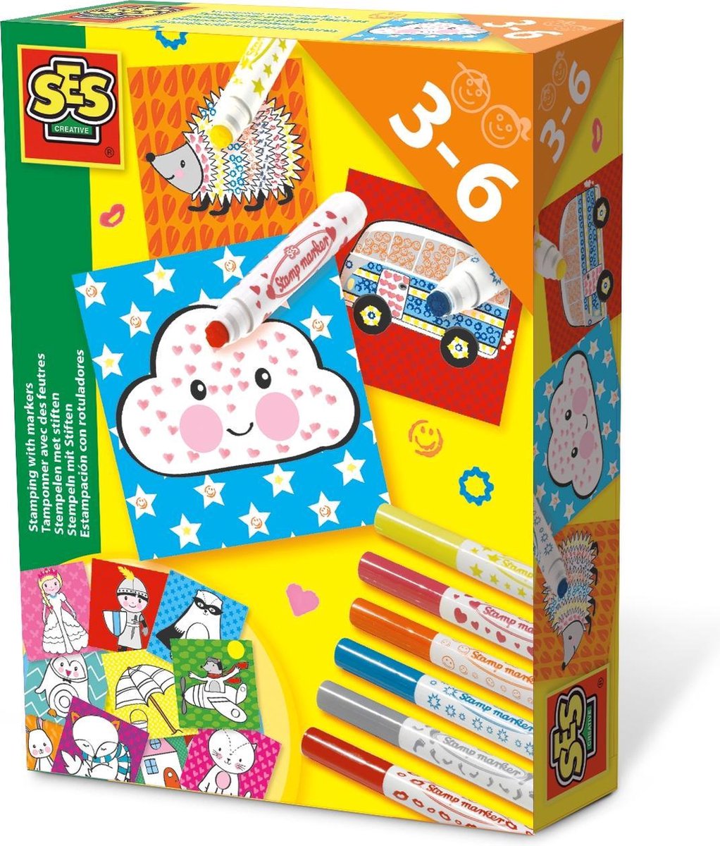 Zin in een leuke knutselactiviteit met je kleuter? Ga stempelen met stiften, een leuke set van SES! Versier de bedrukte vellen met de vrolijke stempelstiften. De 6 kleuren stiften hebben elk een andere stempel. Het resultaat is altijd super! Eigenschappen: - Unieke stempelstiften met verschillende patronen; - Een leuke en eenvoudige manier om kaarten te versieren; - Uitwasbaar uit de meeste textielsoorten; - Stimuleert de creativiteit