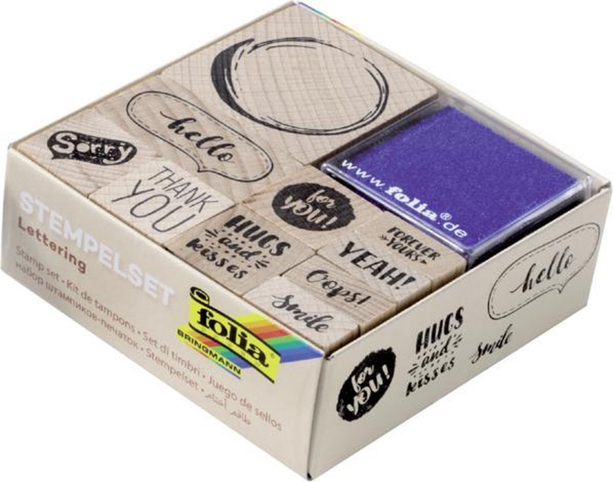 * Maak de mooiste ontwerpen met deze leuke stempelset van Folia. * Houten stempels. * 10 verschillende stempels in verschillende uitvoeringen en maten. * 2 stempelblokken in de kleuren zwart en blauw. * Verpakkingsformaat: 85x85x30mm.