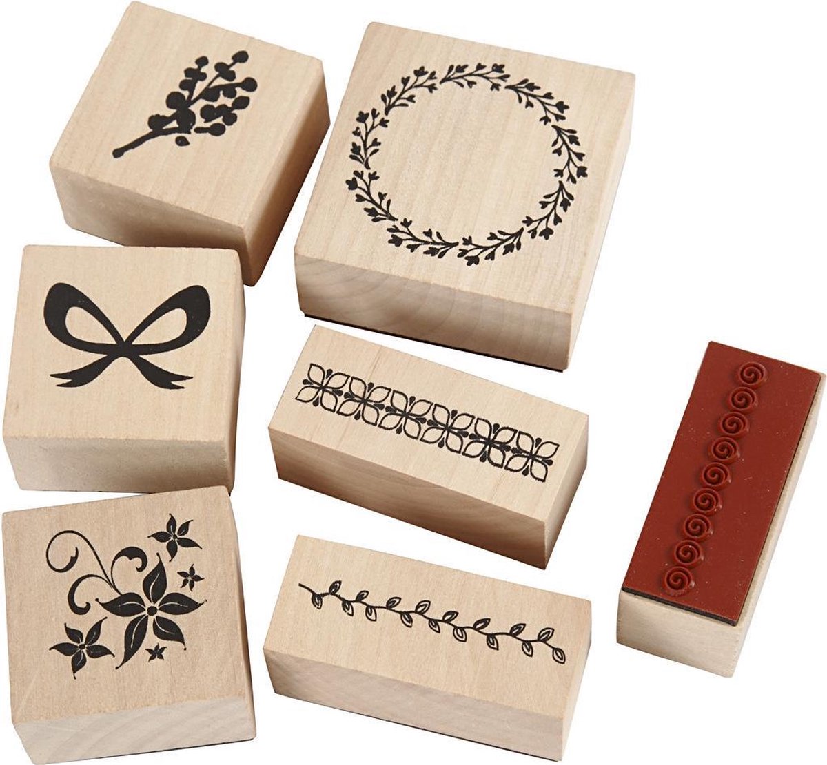 Stempels met houten handvat en rubberen printoppervlakken met gedetailleerde motieven.