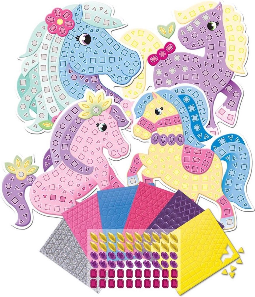 Sticky Mosaics mozaïeken Dankzij de eenvoudige vormen en kleurstelling, in plaats van genummerde etiketten, is het nu heel eenvoudig om prachtige mozaïeken te maken. Deze set is helemaal in het teken van pony's! Specificaties: Kleur: multicolor Geslacht: junior Materiaal: karton, schuimrubber Afmeting verpakking: 24,1 x 24,1 x 3,8 cm (lxbxh) Leeftijd: vanaf 5 jaar Inhoud: 4 Mozaïek sjablonen 4 Muurhaken 600+ Schuimrubber en glittertegels in verschillende kleuren en vormen