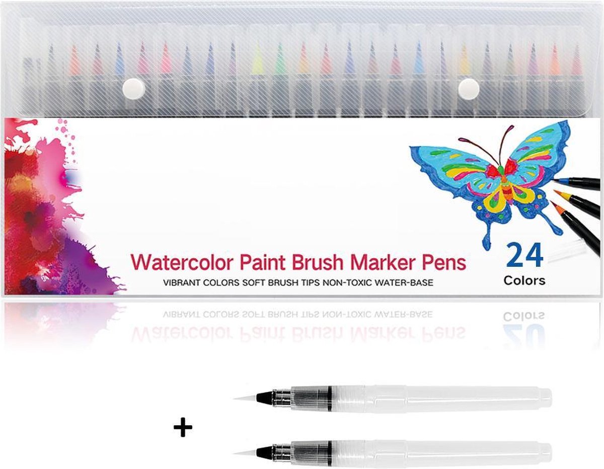 Op zoek naar een origineel cadeau voor je creatieveling? Of wil je zelf het kalligraferen, brush letteren of aquarelverven onder de knie krijgen? Dan is deze set penseelstiften echt iets voor jou! Met deze water brush stiften maak je de mooiste tekeningen en creëer je bijzondere effecten, zoals schaduwen en highlighting. Dubbele punt: flexibele penseelpunt & fineliner Deze innovatieve Brush stiften hebben 2 punten: een dikkere, flexibele penseelpunt van zachte haartjes om grotere oppervlaktes in te kleuren, en een fineliner om het precisiewerk uit te kunnen voeren voor de perfecte afwerking. Hierdoor kan je dikke en dunne lijnen vloeiend in elkaar over laten lopen. Creëer een waanzinnig aquareleffect met de 2 hervulbare water brush stiften Ga met 1 van de 2 water brush pennen over je tekeningen om een prachtig effect te creëren. Laat jouw tekeningen uitvloeien en je creativiteit zijn gang gaan. Geef jouw kunstwerk bijzondere effecten Door de 24 verschillende kleuren in combinatie