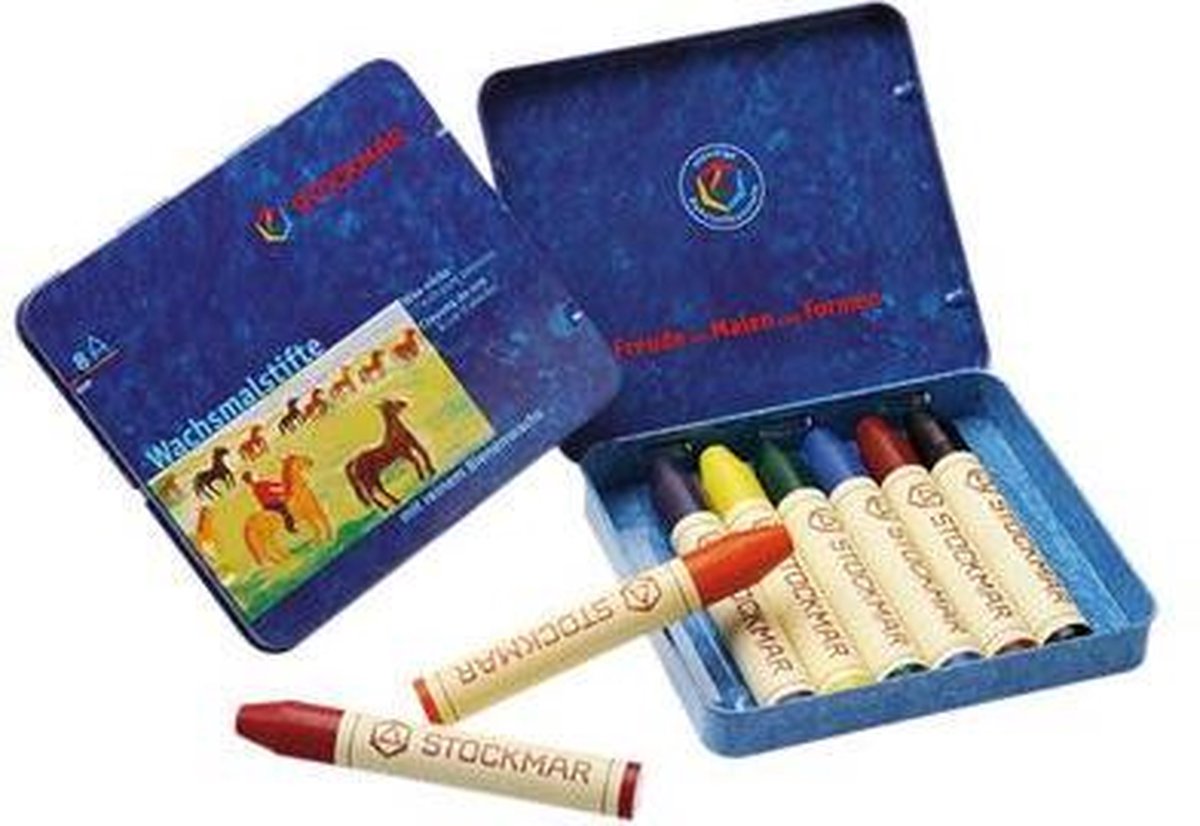 Stockmar bijenwasstiftjes - 8 kleuren standaard assortiment blikken etui, 8 stiften, lengte: 83 mm, diam. 12 mm, met schraper. Iedereen kent de Stockmar wasstiftjes. Ze voldoen aan de hoogste pedagogische, esthetische en kunstzinnige eisen. Door een elegant design, een attractieve verpakking en een plezierige bijenwasgeur, appelleren Stockmar krijtjes aan de zintuigen van het kind. Wat een veelvoud en helderheid aan kleuren en wat een verscheidenheid in het gebruik! Of ze er nu vet of licht mee kleuren, tekenen, schilderen, krassen of kleuren laten "versmelten", deze krijtjes geven jarenlang teken- en kleurplezier Verder worden, door de bijenwas en de daardoor verkregen transparantheid, de kleuren niet vies en grauw, kruimelt het krijt niet zijn ze niet giftig en voldoen aan de hoogste eisen qua milieu en gezondheid. Dit alles maakt deze krijtjes de beste in hun soort. Kleuren: 01 karmijnrood ¦ 03 oranje ¦ 05 citroengeel ¦ 07 groen ¦ 09 blauw ¦ 11 blauwviolet ¦ 13 roodbruin ¦