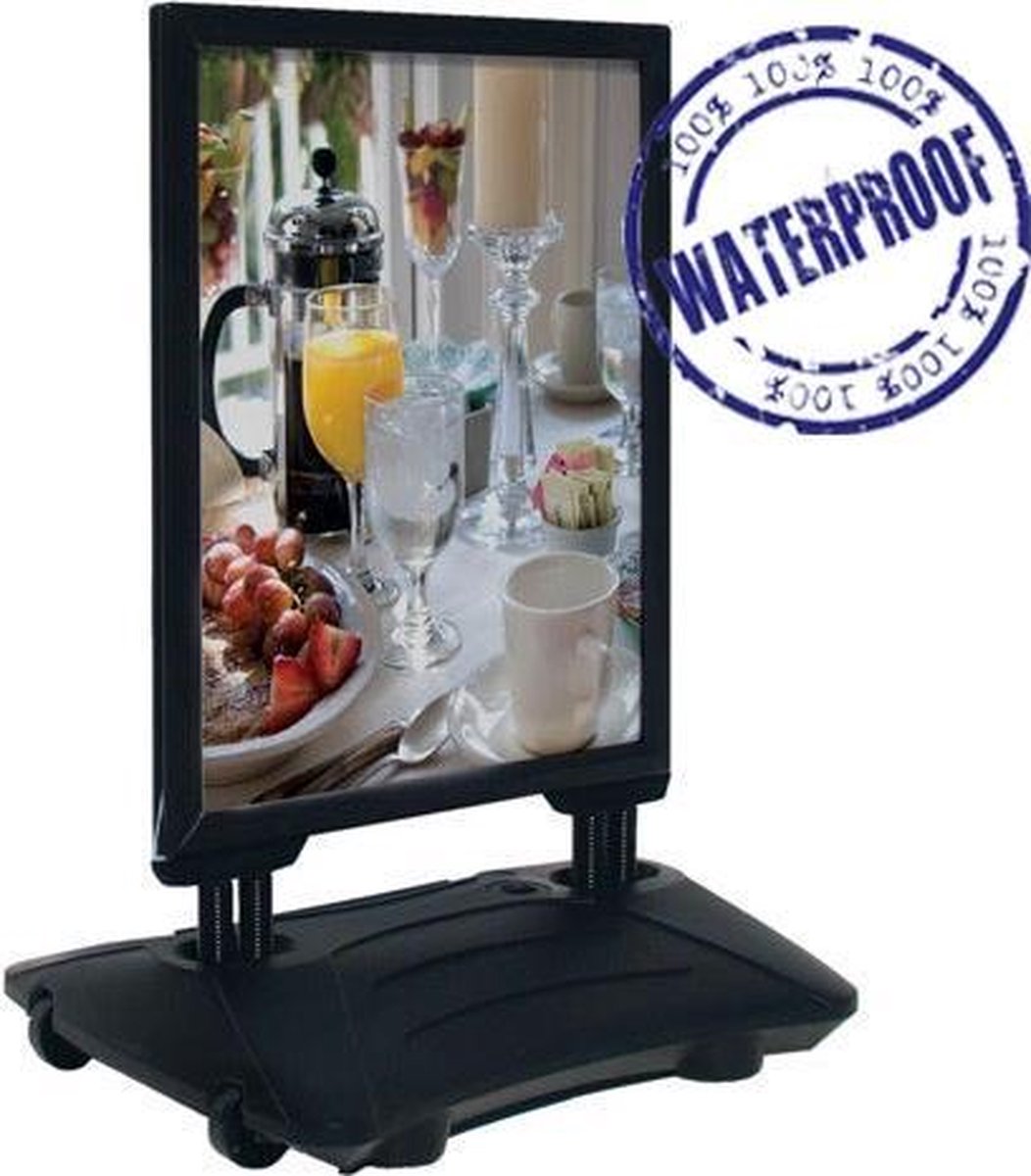 Het meest verkochte, absoluut 100% waterdichte zwarte stoepbord met 2 jaar garantie! Dit stoepbord is gemakkelijk verrijdbaar door de voet op wieltjes en de posters zijn eenvoudig te verwisselen door het gepatenteerde kliksysteem. Bestand tegen zeer zware weersomstandigheden, dus uitermate geschikt voor buitengebruik.Kenmerken:- Moderne uitstraling door zwarte kleur- Postermaat B2 (50x70 cm)- Eenvoudig te monteren, incl. instructie- 100% Waterdicht- Gratis folies en montageset- Voet (30L)- RVS veren en aluminium kliklijst