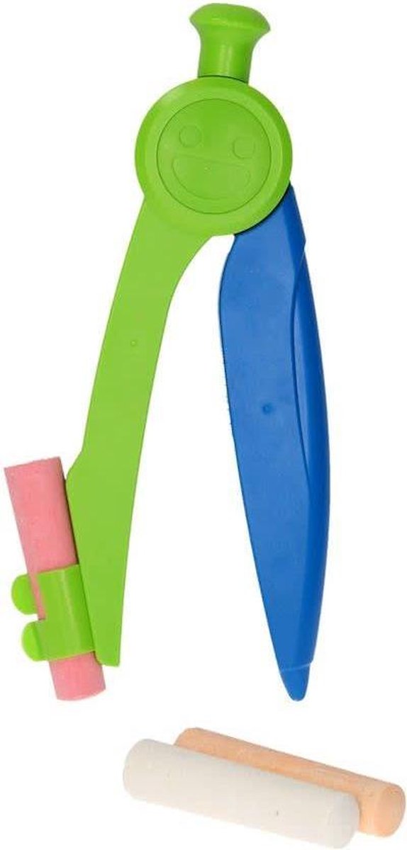 Playfun stoepkrijtjes met passer. Creëer klokken, voetballen en andere ronde figuren op de stoep met deze stoepkrijtset met passer. De set bevat drie stukken stoepkrijt en een mega-passer om de krijtjes in te plaatsen.