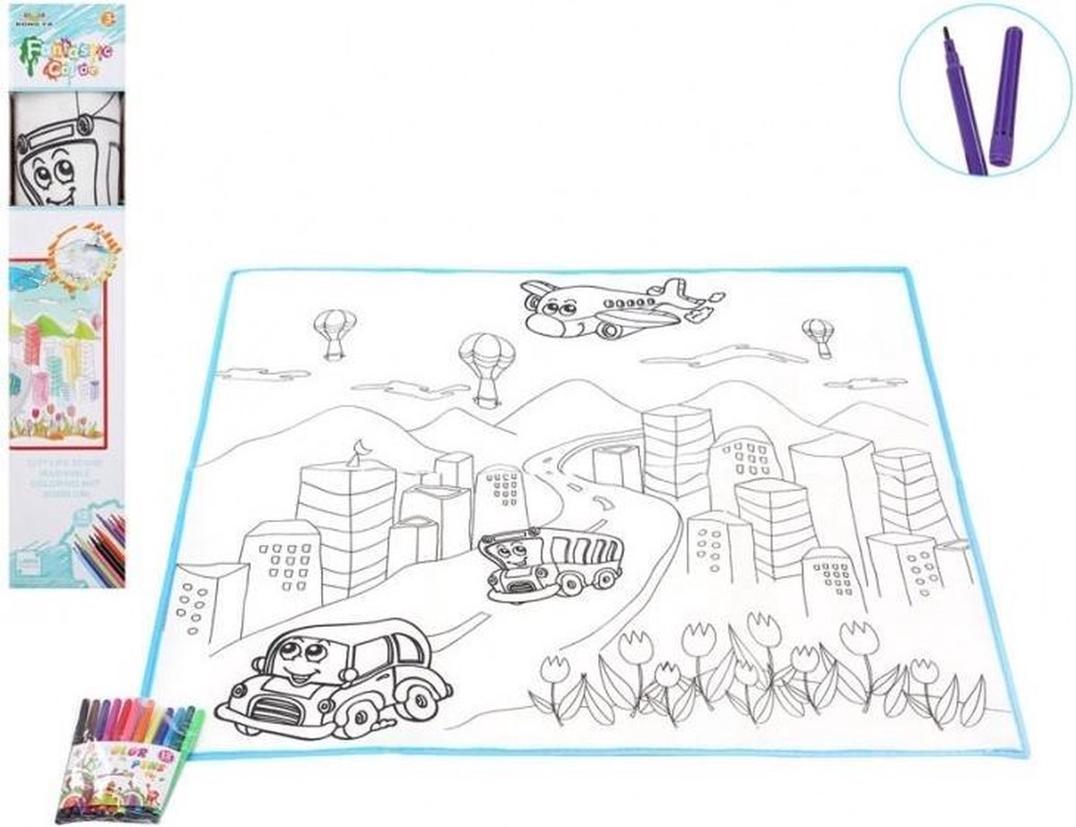 Een stoffen/textiel kleurplaat met een setje met 12 viltstiften. Leg de mat op de grond/tafel en kleur deze mooi in! Opdrukken van o.a. auto's en gebouwen. Afmeting: ca. 80 x 80 cm. Materiaal: katoen. Leuk om kinderen mee te laten knutselen op een kinderfeestje/verjaardagspartijtje! Hobby/knutselmateriaal - knutselbenodigdheden - Kleurplaat/mat van stof - Vloerkleed inkleuren met stiften.