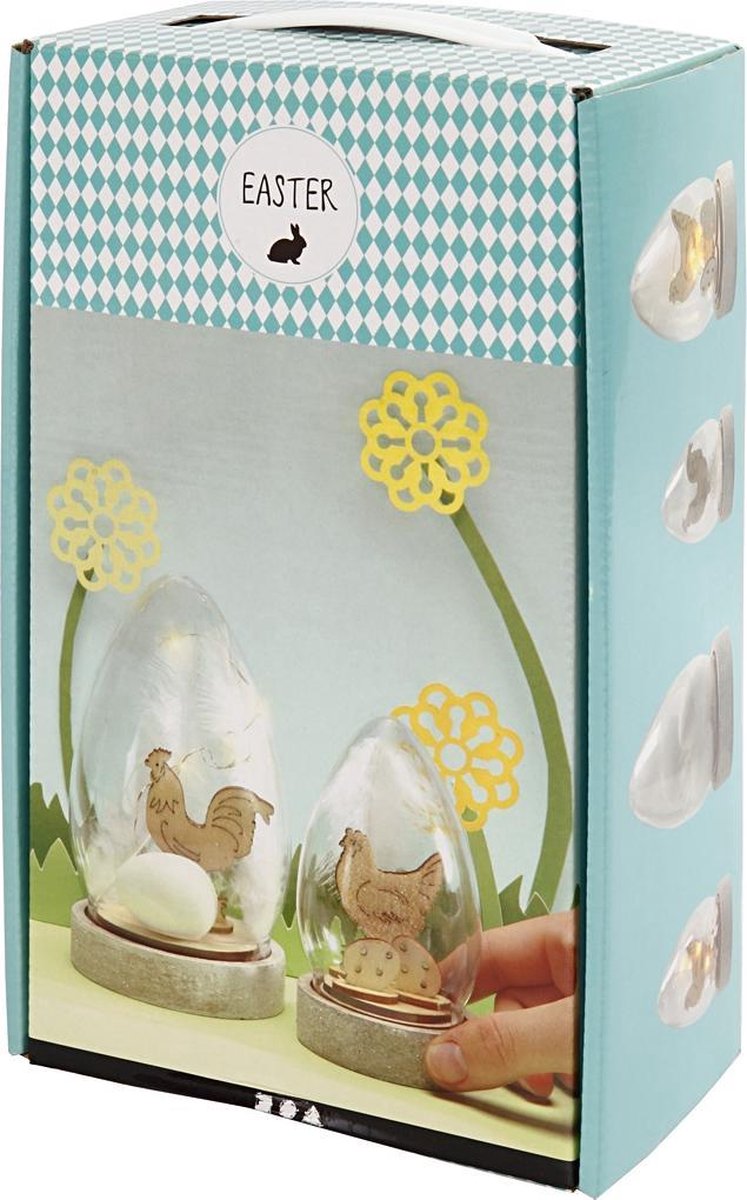 Stolpen met decoratie (2 stuks) Materialenset met 2 eivormige stolpen gemaakt van transparant plastic met losse, houten voet. Met verschillende materialen om kleine paasdecoraties te maken en te plaatsen in de stolp. Inhoud: Houten plaat met uitgestanste figuren om zelf te monteren. Daarnaast 4 kwarteleieren, witte glitter, witte veren, Clear Multi GLue Gel en kleine LED lichtketting op batterijen (niet inclusief + artikelnr. 52330).