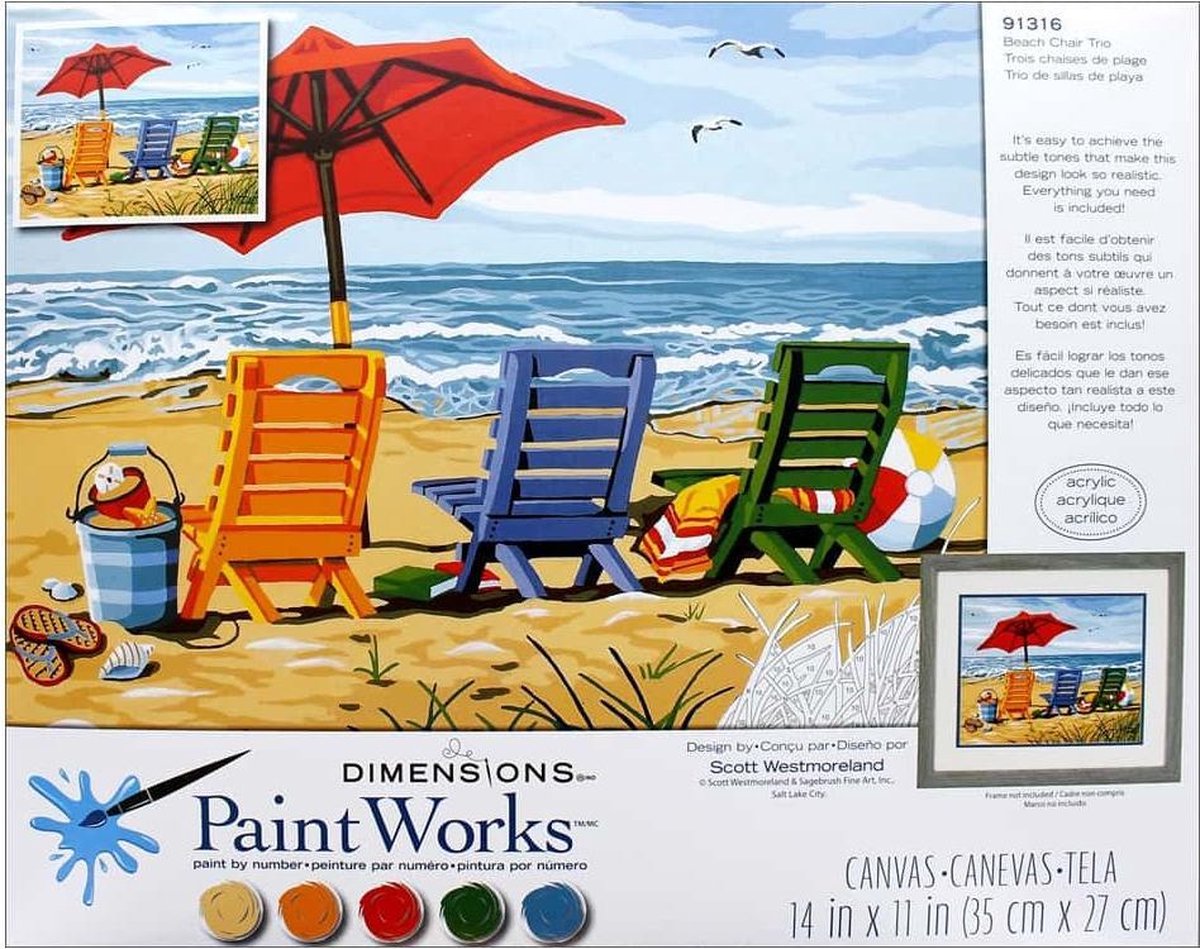 Strandstoelen Schilderen op nummer. Je maakt Schilder op nummer schilderij in het formaat . Je ontvangt een los canvas met daarop enkel de lijnen en nummers. Door de genummerde vlakken in te schilderen met de juiste kleuren verf, creëer je je eigen schilderij. Door jou geschilderd met schilder op nummer! Dit schilderij wordt geleverd inclusief: -Canvas met lijnen en nummers -Voldoende potjes en kleuren acrylverf -Penseel. Schilderijen kunnen licht afwijken van de productafbeelding.