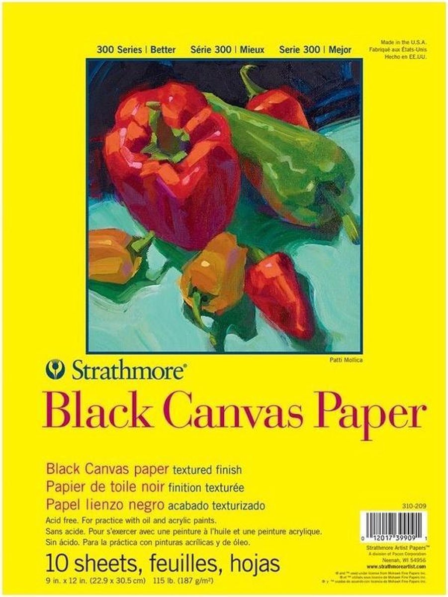 Strathmore black canvas paper. Mooie kwaliteit zuurvrij papier met canvas structuur. Geschikt voor acrylverf, potlood etc. Kleur zwart. Uitvoering op blok, 10 vel op een blok.