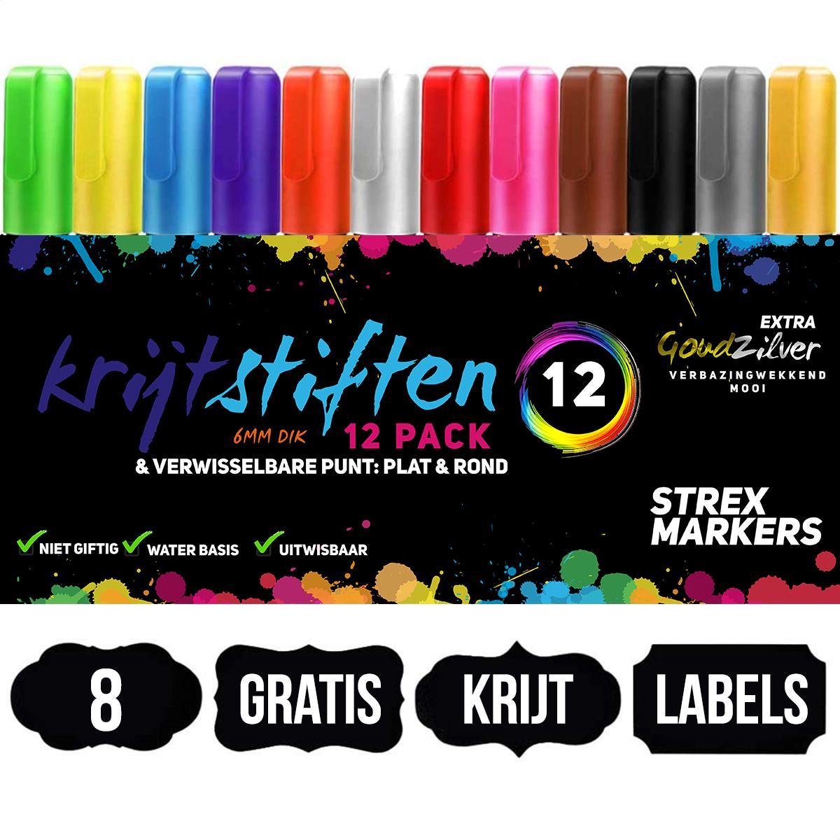 De Strex krijtstiften zijn een geweldige aanvulling voor thuis en op de zaak. Laat je raam, glazen potjes, statistieken of horecabord opvallen met de geweldige kleuren. De set bestaat uit 12 verschillende kleuren inclusief speciale goud en zilver kleuren. Met zoveel kleuren heb je alles in huis voor de mooiste creaties. De stiften zitt in een handige opbergverpakking en komen met 8 krijtlabels . Levendige kleuren Laat je creativiteit stralen met deze set geweldige neon krijtstiften. De stiften bestaan uit hoogwaardig, geconcentreerde vloeibare krijtinkt die elke keer weer voor mooie levendige kleuren zorgt. De set van 12 krijtstiften wordt geleverd in een handige verpakking zodat je altijd alles bij elkaar hebt. Veelzijdig gebruik Ideaal voor het maken van de mooiste hobbyprojecten of voor gebruik op de zaak voor bijvoorbeeld een menukaart of welkomstbord. De stiften bevatten meer inkt dan reguliere krijtstiften en gaan daardoor langer mee. Verwisselbare punt De stiften beschikken