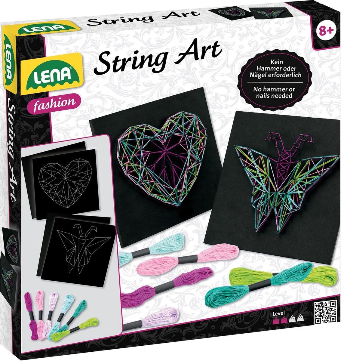 Lena string-art Maak je eigen mooie draadfoto's van een vlinder en een hartje met behulp van de spelden en garens! Specificaties: Geslacht: meisjes Kleur: zwart Materiaal: schuimrubber Afmetingen: 21,5 x 21,5 x 1 cm (L x B x H) Gewicht: 253 gram Leeftijd vanaf: 8 jaar Inhoud: 1 Set spelden 1 Set garens 2 Schuimrubberen platen 2 Motieven 2 Kartonnen vellen