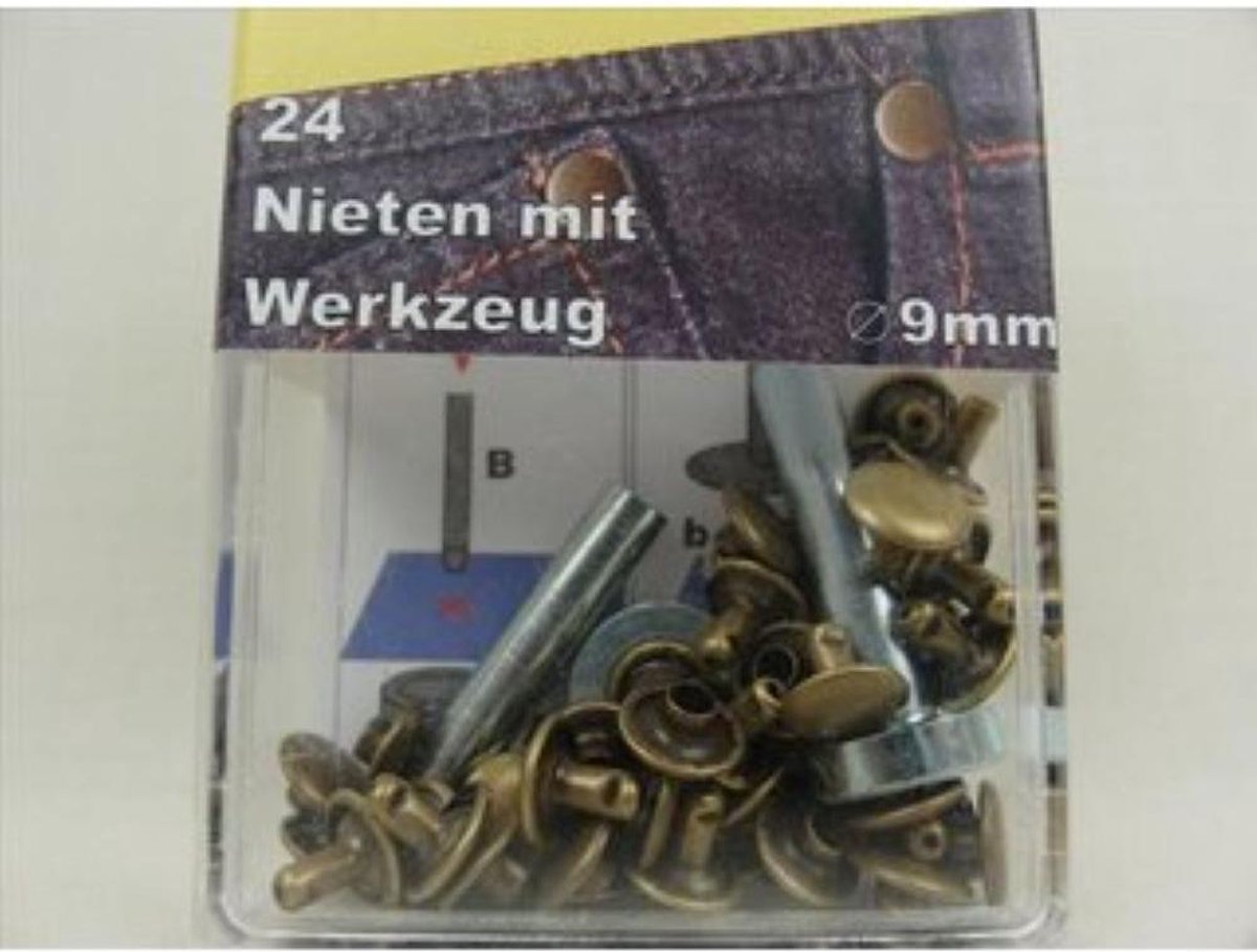 24 roestvrijstalen klinknagels (2-delig) met het juiste gereedschap. De diameter van de koppen is 9 mm in de kleur oud messing. Instructies voor gebruik zijn inbegrepen.