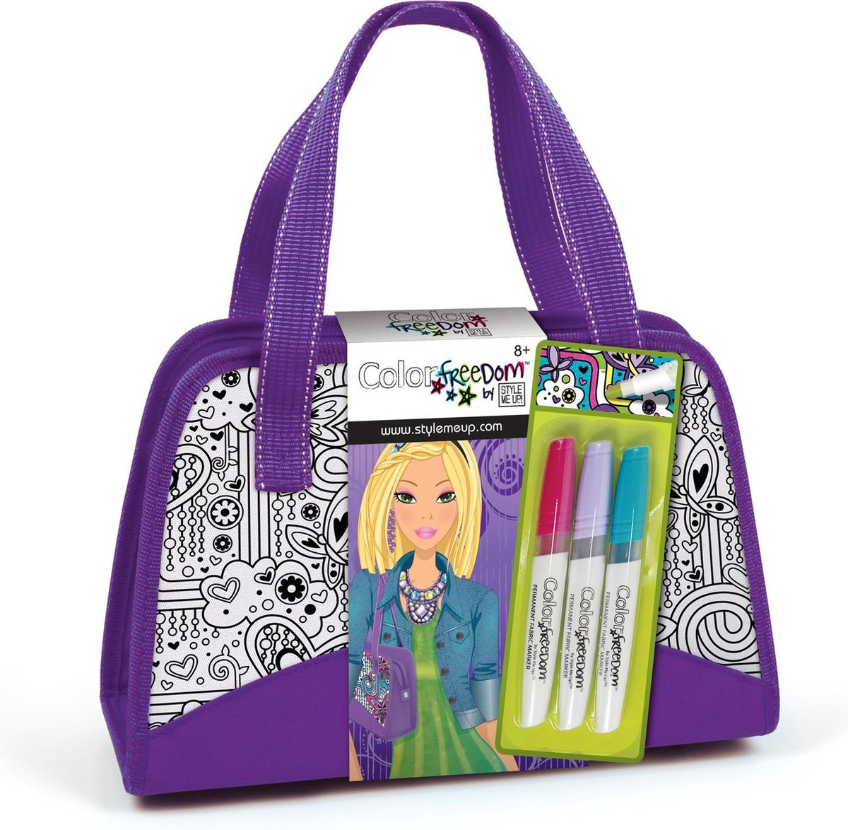 Kleur je handtas helemaal in je eigen hippe stijl. Luxe handtas met paarse accenten. Inhoud: 1 Handtas en 3 textielstiften. Afmeting: 29x19x13 cm.