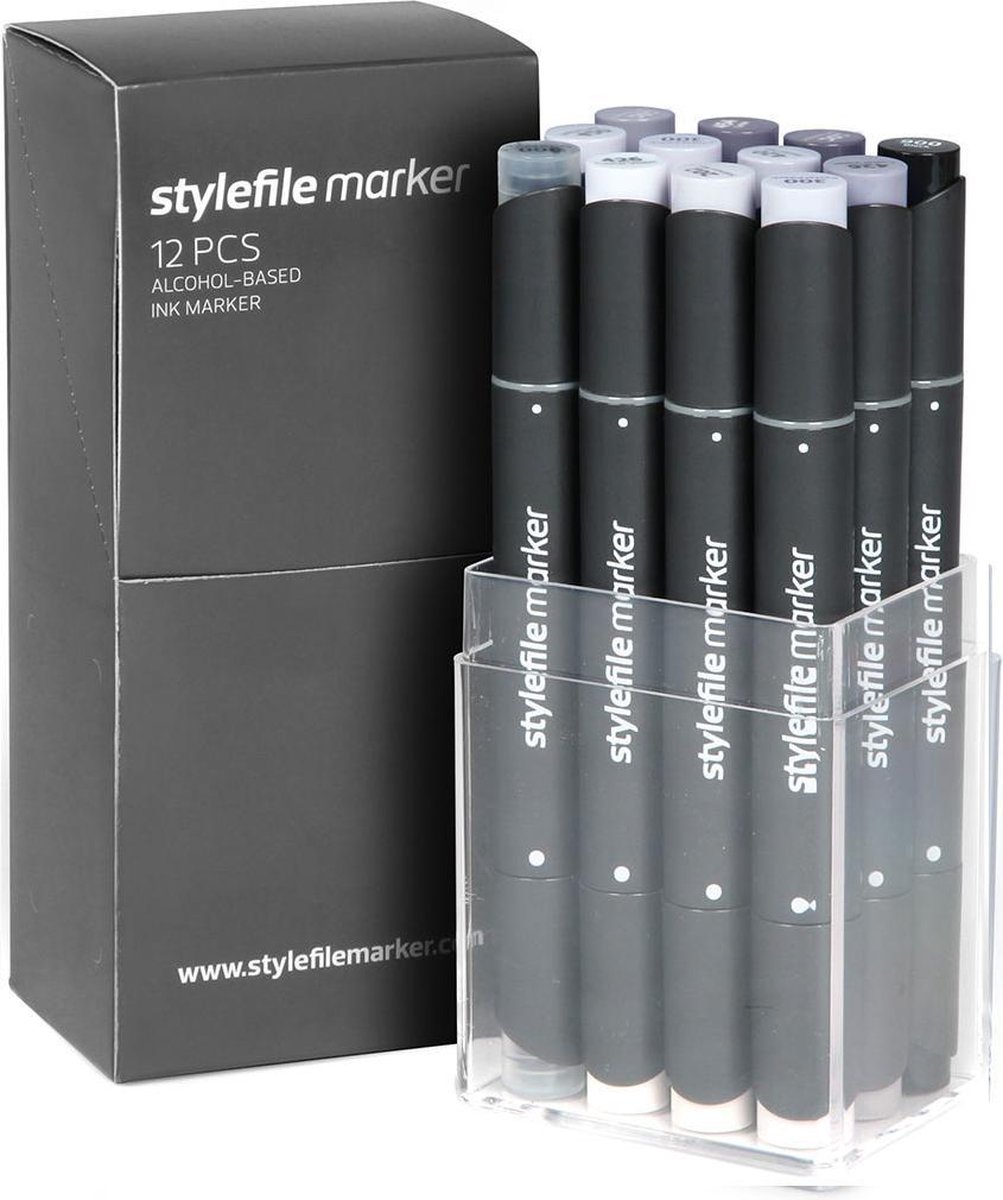 Met de Stylefile Marker 12er Set in Cool Grey heb je een goede basis voor zwart-wit schetsen, schaduw, en dergelijke. Een Colorless Blender, een zwarte stift en 10 koele grijstinten vormen samen een harmonieus afgestemde set, waarmee je direct aan de slag kan. De Stylefile marker is perfect voor tekeningen, schetsen en afbeeldingen van alle soorten en scoort met een overtuigende prijs-kwaliteitsverhouding! – Ergonomisch ontwerp – Marked wig en fineliner tip – Kwaliteit alcohol gebaseerde inkt – Resistente tips Inhoud: 1x 000, 1x 900, 1x CG0 elk – CG9.