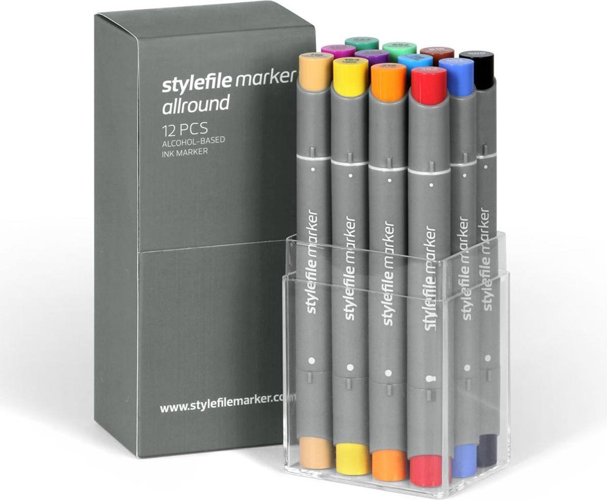 De nieuwe Stylefile marker allround heeft de naam “allround” zeker verdient! Overtuig jezelf met de Stylefile Marker Allround set van 12 Main A van zijn veelzijdigheid: De dunne finelinerpunt is perfect voor de precieze lijnen, de dikkere ronde punt voor de grotere vlakken en dikke lijnen. – Speciaal voor ons ontwikkelde alcohol tinten – Zonder Xylol, geur arm – Robuuste punten van marktleiders – Gemarkeerde fineliner- en ronde punt – Precieze lijnen en grote vlakken kleuren met één stift – Kleurmarkering op de dop – Eenvoudig en ergonomisch design De Stylefile Marker Allround set van 12 ”Main A” bevat: 118 (yellow ochre) 164 (lemon yellow) 216 (orange) 362 (carmine) 460 (azalea purple) 466 (deep violet) 518 (cerulean blue) 552 (cobalt blue) 644 (viridian) 652 vivid green) 816 (natural oak) 900 (black)