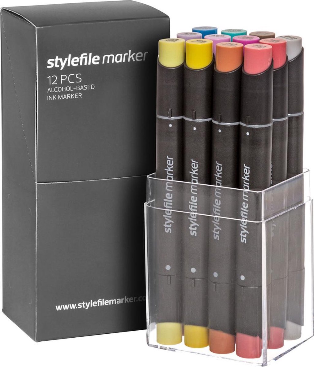 De Stylefile Marker Set van 12 is een perfect op elkaar afgestemde set markers in 12 verschillende harmoniseerende kleuren uit een groot palet van 124 kleuren. Deze marker op alcohol-basis heeft binnen een zeer korte tijd een plek op de markt veroverd en is ideaal voor illustraties, graffiti, manga, design, mode en architectuur. Zijn eigenschappen: – fineliner- en V-tip met een markering op de marker voor een snelle oriëntatie – zeer goede prijs-kwaliteit verhouding – dop met kleurmarkering en roll-stop – robuuste tip – minimalistisch, ergonomisch ontwerp – goede inkt-flow