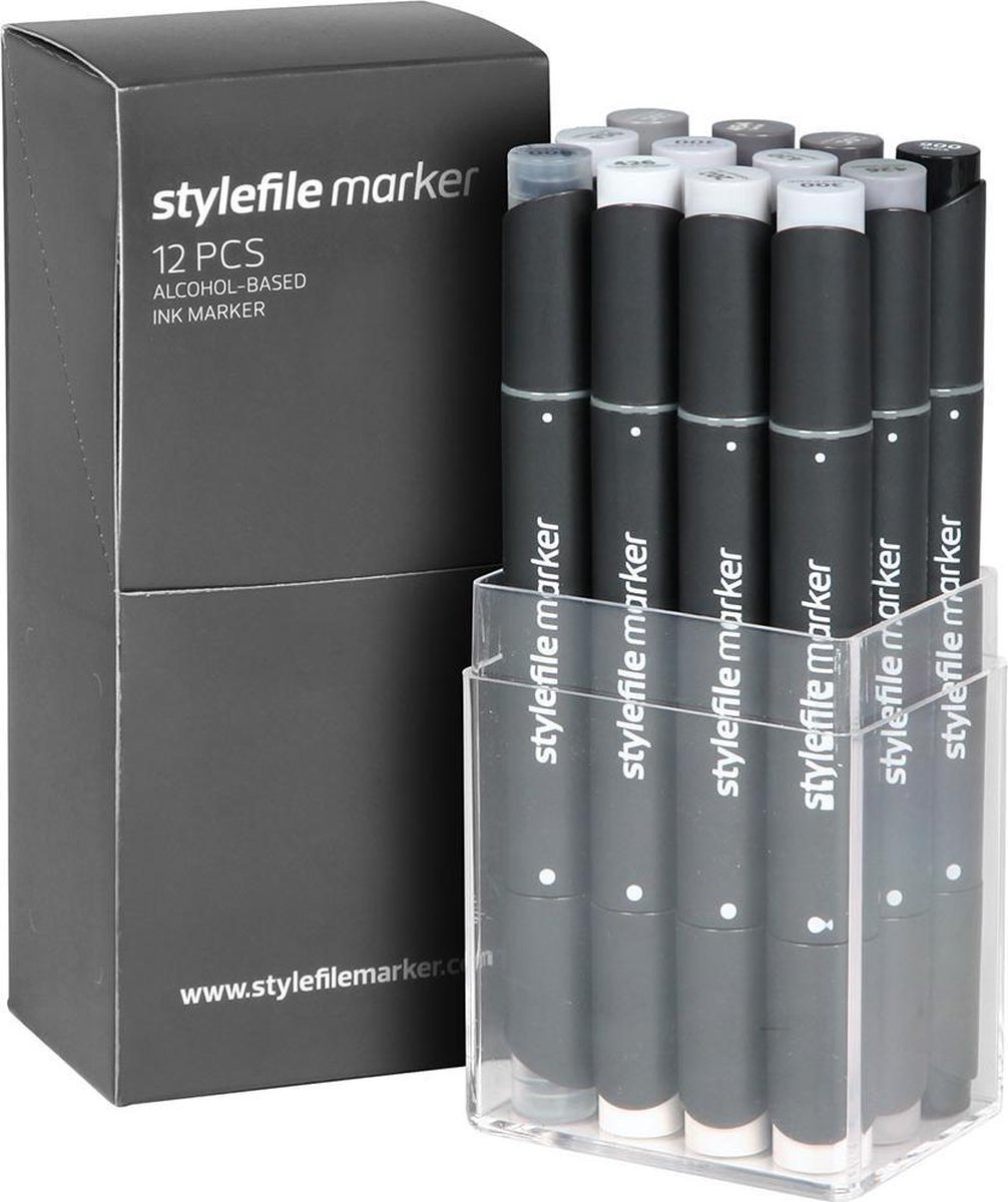 De Stylefile Marker 12er Set in Neutral Grey is een goede basis voor het opstellen van allerlei verschillende tinten grijs. De set bestaat uit een zwarte stift, en een Kleurloos Blender en 10 subtiele schakeringen in neutrale grijstinten. Perfect uit te breiden met andere Stylefile marker sets! – Veel waar voor je geld – Ergonomisch ontwerp – Marked wig en fineliner tip – Kwaliteit alcohol gebaseerde inkt – Bestandige tips Inhoud: 000 (Blender), 900 (zwart), ng0 – NG9.