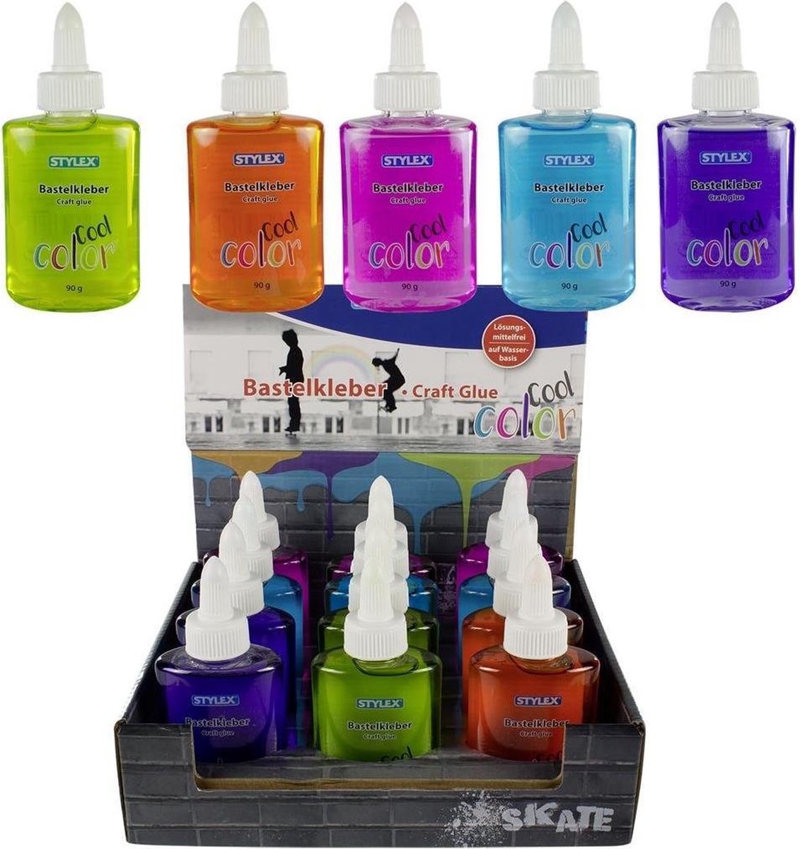 Stylex gekleurde hobbylijm, 90 gr. Verkrijgbaar in verschillende uitvoeringen. U kunt niet kiezen, maar ontvangt een willekeurige uitvoering.