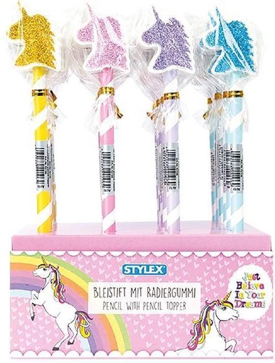 Trendy Unicorn set van een HB potlood en een gum, in 4 assorti kleuren: groen, roze, paars en goud. Wordt assorti geleverd.