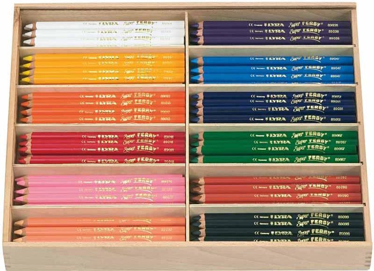 Lyra premium kwaliteit driehoekige kleurpotloden Geleverd in een houten display met 12 kleuren, van elk 12 stuks
