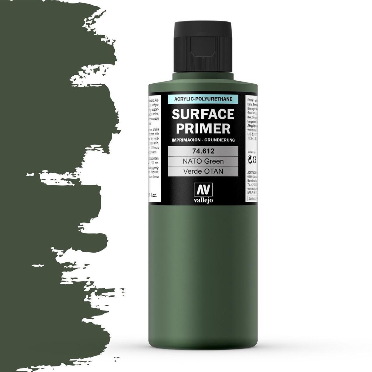 Vallejo Surface Primer Nato Green (200ml. 74612) is een grote pot groene grondverf op polyurethaan waterbasis. Deze grondverf kan direct gebruikt worden of gemixed worden met bijvoorbeeld mediums of vernissen. De grondverf nivelleert zichzelf en droogt mat en hard op, waarbij het de details bewaard. Perfect voor plastic, resin en metalen en is zeer geschikt als airbrushverf in combinatie met een Airbrush. Surface Primer kan eenvoudig gereinigd worden met water, of bij hardnekkig vuil adviseren we Airbrush Cleaner. Let op! Meng de Surface Primer niet met bijvoorbeeld alcohol of andere oplosmiddelen, Kijk voor een interessante review op: Tale of Paintes BLOG