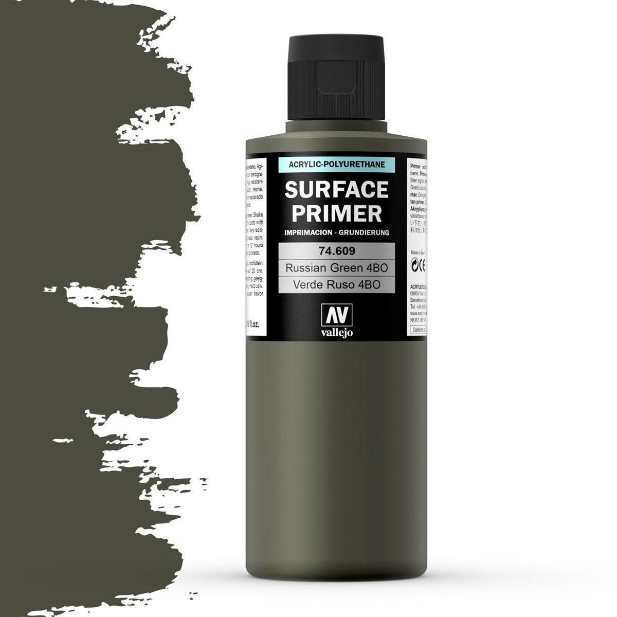 Vallejo Surface Primer Russian Green 4BO (200ml. 74609) is een grote pot grijsgroene grondverf op polyurethaan waterbasis. Deze grondverf kan direct gebruikt worden of gemixed worden met bijvoorbeeld mediums of vernissen. De grondverf nivelleert zichzelf en droogt mat en hard op, waarbij het de details bewaard. Perfect voor plastic, resin en metalen en is zeer geschikt als airbrushverf in combinatie met een Airbrush. Surface Primer kan eenvoudig gereinigd worden met water, of bij hardnekkig vuil adviseren we Airbrush Cleaner. Let op! Meng de Surface Primer niet met bijvoorbeeld alcohol of andere oplosmiddelen, Kijk voor een interessante review op: Tale of Paintes BLOG