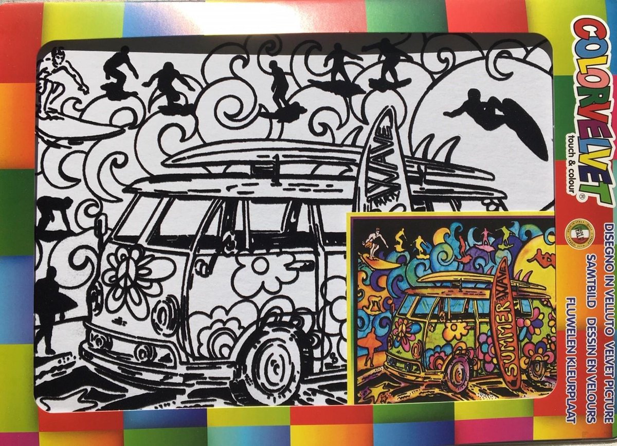 T1 naar het strand Colorvelvet kleurpakket inclusief 12 stiften. Wat is Colorvelvet? Met Colorvelvet maak je de mooiste kunstwerken maar niet zoals de standaard kleurplaten. De tekeningen zijn gemaakt van een speciaal absorberend karton, gedeeltelijk bedekt met een 1mm dikke zwarte laag fluweel waardoor je een duidelijke scheiding krijgt met hetgeen wat je moet inkleuren. Behalve dat dit stuk fluweel ervoor zorgt dat je de witte vlakken makkelijk kunt inkleuren komt het zwarte fluweel naar voren wat een heel chique geheel geeft op je Colorvelvet kleurplaat. Deze tekeningen zijn eenvoudig, dit maakt Colorvelvet leuk en leerzaam waardoor dit ideaal is voor alle leeftijden vanaf 3 jaar en ouder. Met colorvelvet hebben kinderen plezier en leren ze tegelijkertijd, waardoor ze kleurrijke tekeningen maken waarmee ze ook hun slaapkamer kunnen versieren. Maar ook voor volwassenen is Colorvelvet zeer geschikt om lekker creatief bezig te zijn. De tekeningen kan je op allerlei verschillende