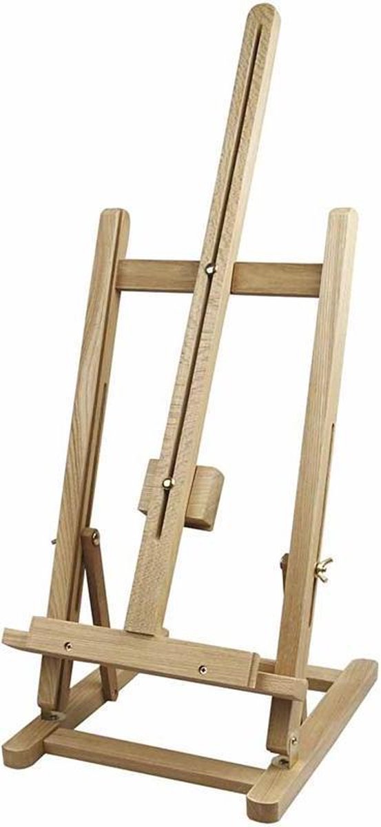 Tafelezel (1 stuks) Tafelezel gemaakt van iepenhout - met aanpasbare steun - makkelijk in te klappen - max canvas hoogte: 56cm - gewicht 1,3kg. Opgevouwen afmeting: 67x30x7 cm.