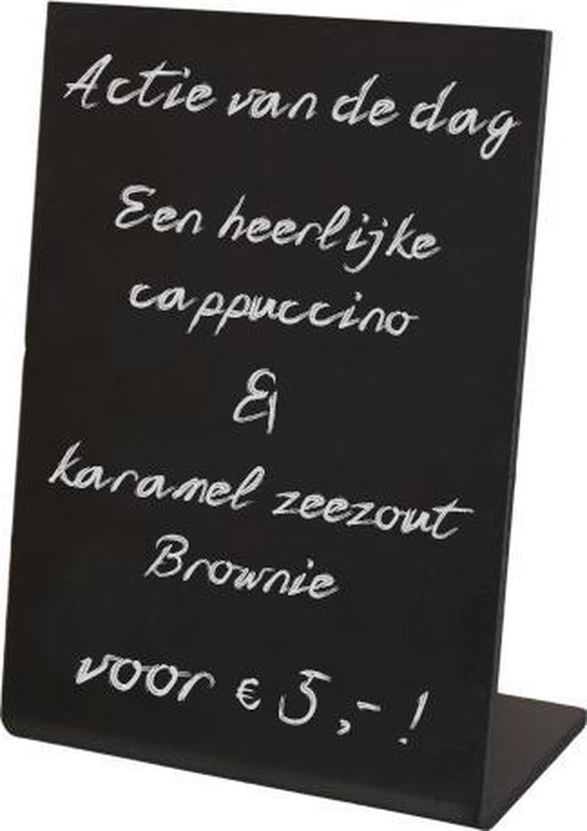 Uniek en exclusief, het tafelkrijtbordje! Dit zwarte krijtbordje voor op tafel is een echte blikvanger. Het bordje is ideaal in gebruik voor aanbiedingen en menu's en is beschrijfbaar met een krijtstift. Perfect voor in de horeca of in de winkel. Kenmerken: Afmeting A4 (21 x 29,7 cm) Voor watervaste en waterbasis krijtstift (niet geschikt voor gewone krijtjes) Makkelijk te reinigen Trendy uitstraling