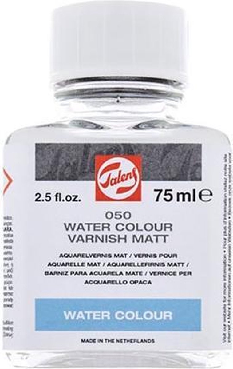 Talens Aquarelvernis Mat - Flacon 75Ml voor het minder vochtgevoelig maken van de schildering Samenstelling: kleurloze, niet vergelende acrylaathars, terpentine, matteringsmiddelen (silica) - Droogt binnen enkele uren - Weinig invloed op de glansgraad - Niet vergelend - Droogt watervast op, maakt de schildering hierdoor minder vochtgevoelig - Gebruiksklaar, niet verdunnen - In één laag aanbrengen en in één richting uitstrijken - Niet geschikt voor extreem zuigende ondergronden - Schudden voor gebruik - Kwasten reinigen met terpentine - Licht ontvlambaar