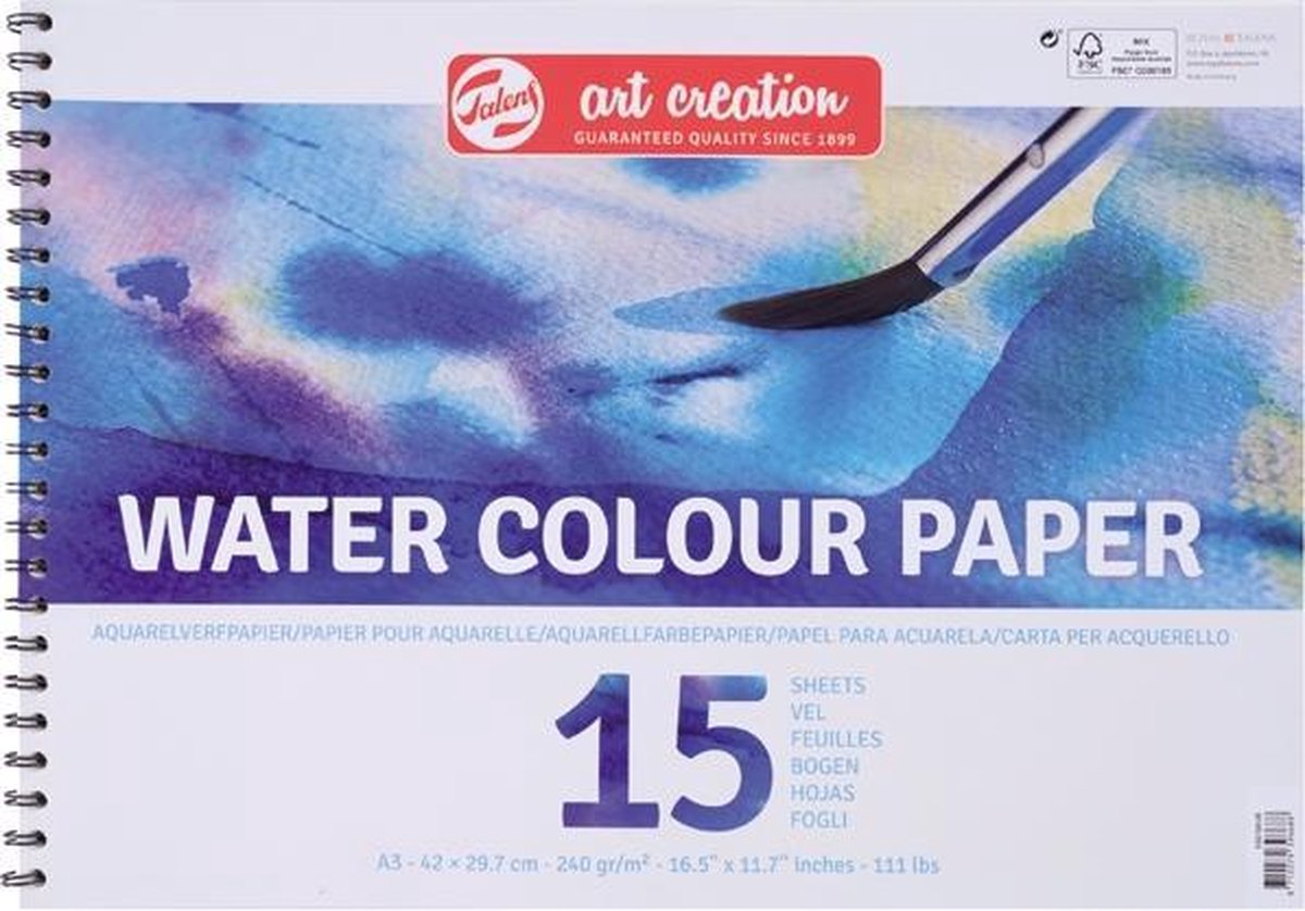 Papier speciaal om als ondergrond voor aquarelverf te gebruiken. • 240 grams • A3-formaat • 15 vellen • FSC-mix gecertificeerd Talens Art Creation is het merk voor creatievelingen en beginnende kunstenaars die meteen een goede kwaliteit tegen een betaalbare prijs willen.
