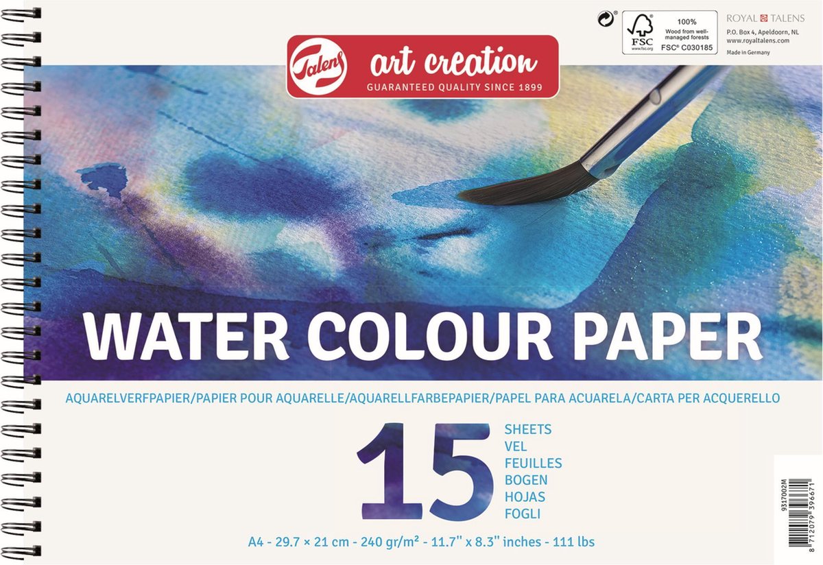 Papier speciaal om als ondergrond voor aquarelverf te gebruiken. • 240 grams • A4-formaat • 15 vellen • FSC-mix gecertificeerd Talens Art Creation is het merk voor creatievelingen en beginnende kunstenaars die meteen een goede kwaliteit tegen een betaalbare prijs willen.