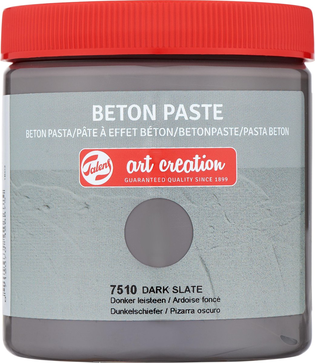 Beton pasta is een dekkende pasta, die een rauwe beton 'look' geeft aan uiteenlopende ondergronden. Deze stoere, ruwe uitstraling past helemaal in het interieur van nu! Beton pasta is meer een pasta dan verf en alleen geschikt voor binnengebruik. Deze flacon bevat 250 ml in de kleur donker leisteen. De pasta is op waterbasis. Beton pasta is verkrijgbaar in 5 tinten en flacons van 100 ml en 250 ml. Voor het maken van ruwere ondergronden kan je een paletmes gebruiken, voor een gladdere afwerking is een penseel of spons handiger. Het is niet nodig om grondverf als onderlaag aan te brengen. Talens Art Creation Creative De nieuwe lijn van Talens Art Creation is ontwikkeld voor de creatieve hobbyist en liefhebber van do-it-yourself. Talens Art Creation biedt uitstekende materialen tegen de best mogelijke prijs. Het Creative assortiment bestaat uit diverse verflijnen zoals Textile, Glass & Porcelain, Indoor & Outdoor verf, Vintage krijtverf, Metallic verf en nog vele andere materialen voor