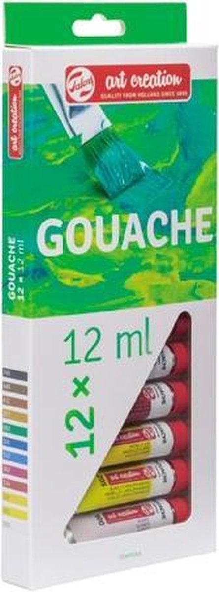 Mooie set met 12 kleuren in 12 ml tubes Talens Art Creation gouache. Met deze kleuren kun je prachtige kleurencombinaties maken. De gouache van Talens Art Creation is een dekkende verf waarmee je mooie, streeploze en matte oppervlakken kunt schilderen. De verf is waterverdunbaar en droogt binnen enkele minuten, dus je kan lekker vlot doorwerken. Te gebruiken op verschillende ondergronden zoals papier, karton en hout. Inhoud: - 12 tubes 12 ml plakkaatverf: Wit, Citroengeel, Lichtgeel, Scharlaken, Donkerrose, Kobaltblauw, Lichtblauw, Donkergroen, Gele oker, Sienna gebrand, Omber gebrand, Zwart