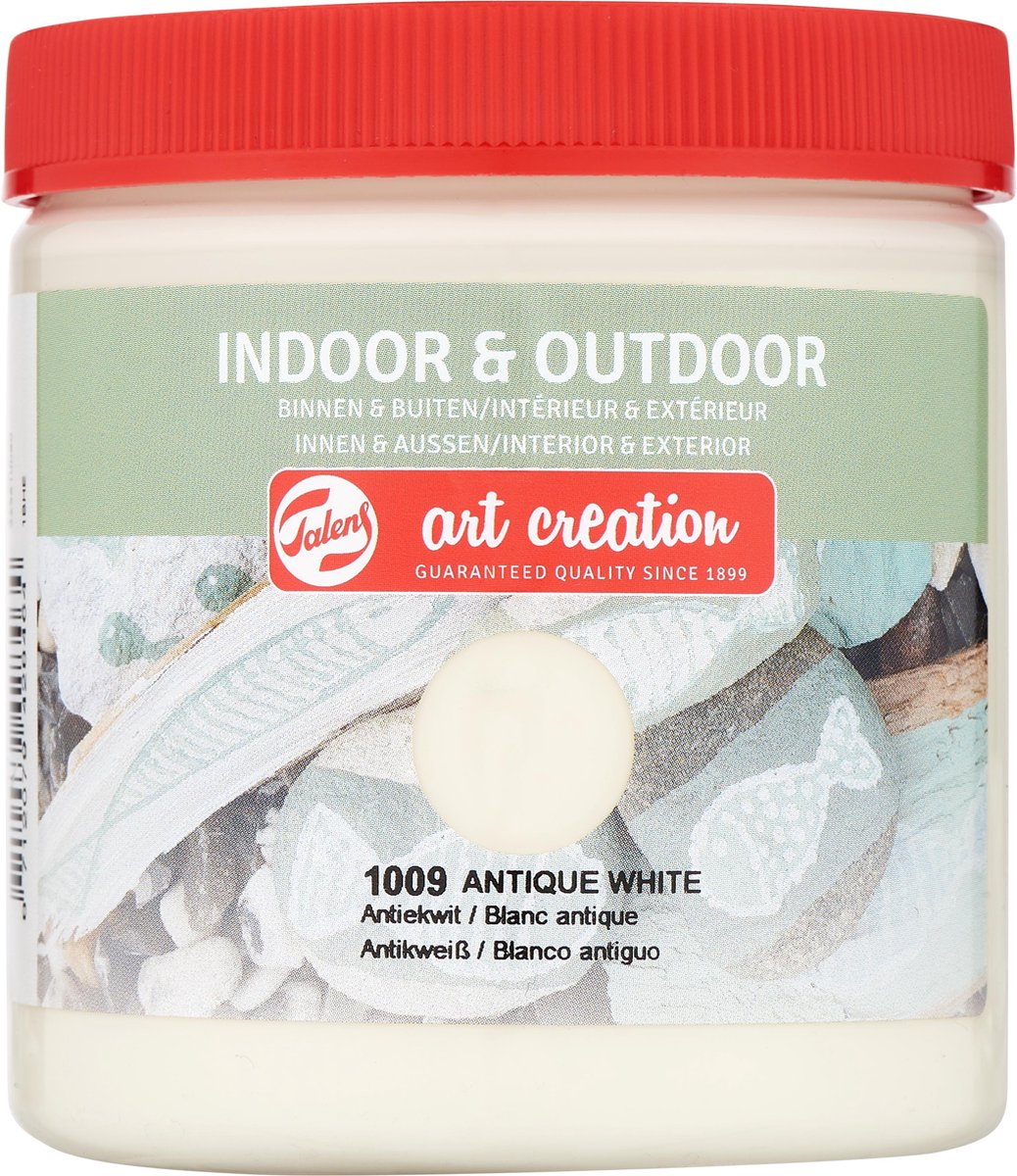 Talens Art Creation Indoor & Outdoor verf is een universele verf met een goede dekkracht, voor zowel gebruik binnenshuis als buitenshuis. Met deze zijdeglansverf kan je bijvoorbeeld ook vogelhuisjes en bloempotten decoreren. Verkrijgbaar in maar liefst 40 kleuren met zowel heldere tinten als vintage kleuren. Na 24 uur droogtijd is de verf waterbestendig en kan het buiten geplaatst worden. Deze flacon bevat 250 ml in de kleur antiekwit. De verf is op waterbasis. Talens Art Creation Creative De nieuwe lijn van Talens Art Creation is ontwikkeld voor de creatieve hobbyist en liefhebber van do-it-yourself. Talens Art Creation biedt uitstekende materialen tegen de best mogelijke prijs. Het Creative assortiment bestaat uit diverse verflijnen zoals Textile, Glass & Porcelain, Indoor & Outdoor verf, Vintage krijtverf, Metallic verf en nog vele andere materialen voor het maken van de mooiste creaties, kunstwerken en decoraties voor in en om huis.