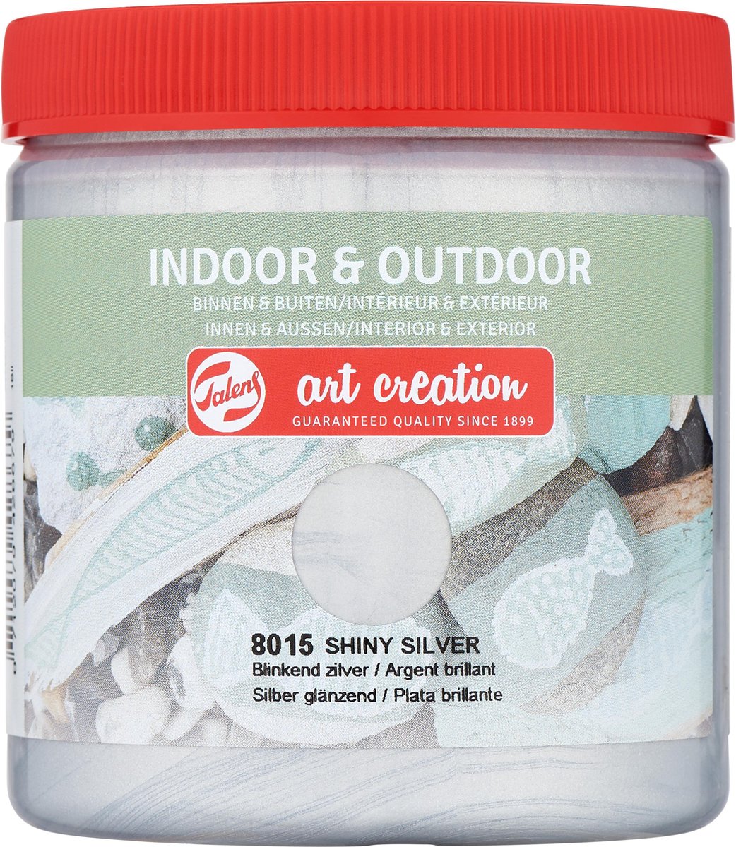 Talens Art Creation Indoor & Outdoor verf is een universele verf met een goede dekkracht, voor zowel gebruik binnenshuis als buitenshuis. Met deze zijdeglansverf kan je bijvoorbeeld ook vogelhuisjes en bloempotten decoreren. Verkrijgbaar in maar liefst 40 kleuren met zowel heldere tinten als vintage kleuren. Na 24 uur droogtijd is de verf waterbestendig en kan het buiten geplaatst worden. Deze flacon bevat 250 ml in de kleur blinkend zilver. De verf is op waterbasis. Talens Art Creation Creative De nieuwe lijn van Talens Art Creation is ontwikkeld voor de creatieve hobbyist en liefhebber van do-it-yourself. Talens Art Creation biedt uitstekende materialen tegen de best mogelijke prijs. Het Creative assortiment bestaat uit diverse verflijnen zoals Textile, Glass & Porcelain, Indoor & Outdoor verf, Vintage krijtverf, Metallic verf en nog vele andere materialen voor het maken van de mooiste creaties, kunstwerken en decoraties voor in en om huis.