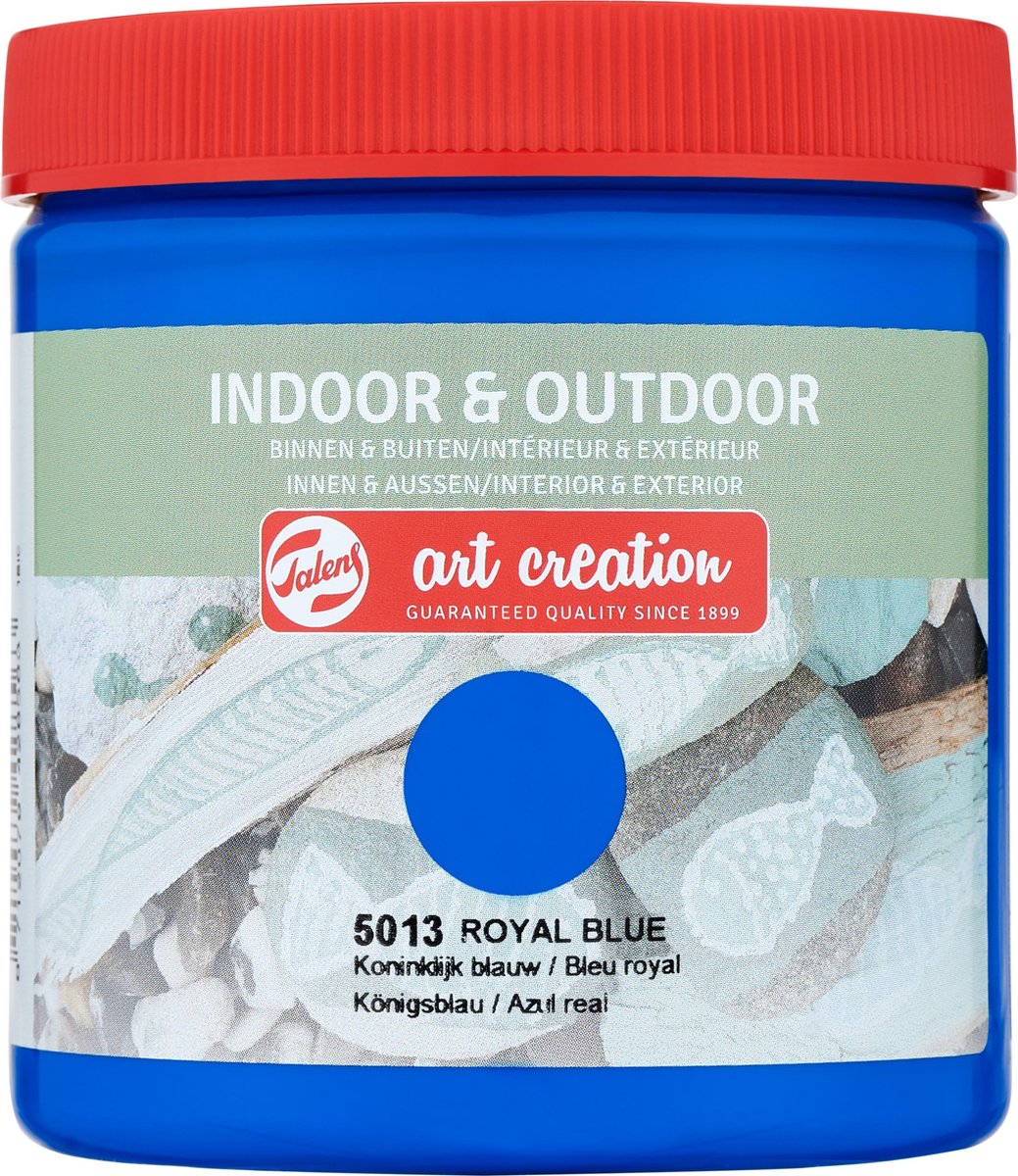 Talens Art Creation Indoor & Outdoor verf is een universele verf met een goede dekkracht, voor zowel gebruik binnenshuis als buitenshuis. Met deze zijdeglansverf kan je bijvoorbeeld ook vogelhuisjes en bloempotten decoreren. Verkrijgbaar in maar liefst 40 kleuren met zowel heldere tinten als vintage kleuren. Na 24 uur droogtijd is de verf waterbestendig en kan het buiten geplaatst worden. Deze flacon bevat 250 ml in de kleur koninklijk blauw. De verf is op waterbasis. Talens Art Creation Creative De nieuwe lijn van Talens Art Creation is ontwikkeld voor de creatieve hobbyist en liefhebber van do-it-yourself. Talens Art Creation biedt uitstekende materialen tegen de best mogelijke prijs. Het Creative assortiment bestaat uit diverse verflijnen zoals Textile, Glass & Porcelain, Indoor & Outdoor verf, Vintage krijtverf, Metallic verf en nog vele andere materialen voor het maken van de mooiste creaties, kunstwerken en decoraties voor in en om huis.