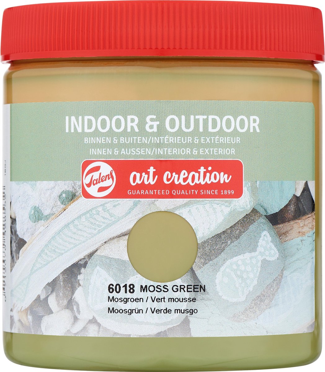 Talens Art Creation Indoor & Outdoor verf is een universele verf met een goede dekkracht, voor zowel gebruik binnenshuis als buitenshuis. Met deze zijdeglansverf kan je bijvoorbeeld ook vogelhuisjes en bloempotten decoreren. Verkrijgbaar in maar liefst 40 kleuren met zowel heldere tinten als vintage kleuren. Na 24 uur droogtijd is de verf waterbestendig en kan het buiten geplaatst worden. Deze flacon bevat 250 ml in de kleur mosgroen. De verf is op waterbasis. Talens Art Creation Creative De nieuwe lijn van Talens Art Creation is ontwikkeld voor de creatieve hobbyist en liefhebber van do-it-yourself. Talens Art Creation biedt uitstekende materialen tegen de best mogelijke prijs. Het Creative assortiment bestaat uit diverse verflijnen zoals Textile, Glass & Porcelain, Indoor & Outdoor verf, Vintage krijtverf, Metallic verf en nog vele andere materialen voor het maken van de mooiste creaties, kunstwerken en decoraties voor in en om huis.