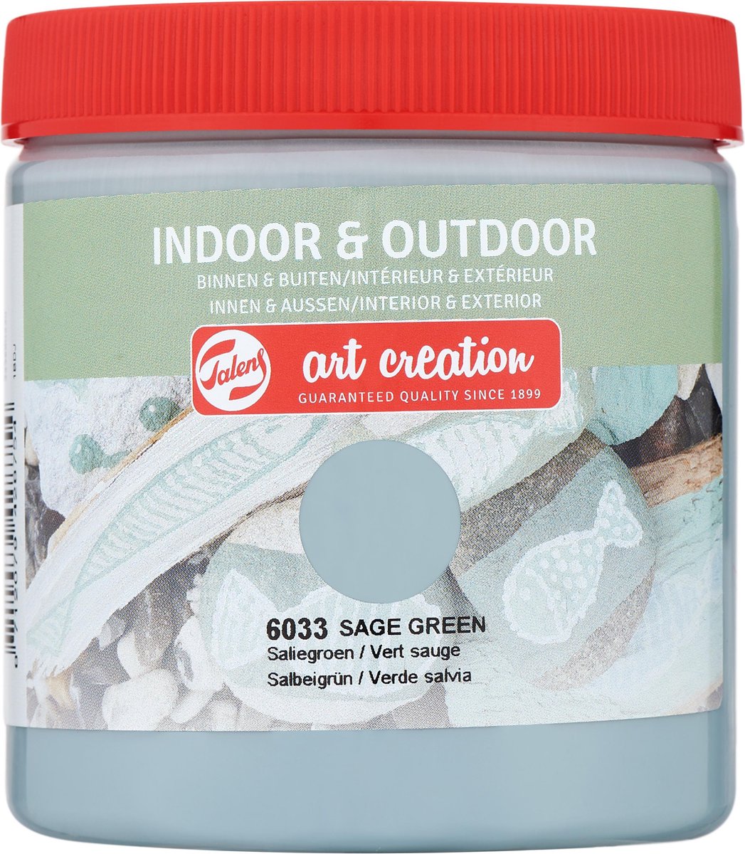 Talens Art Creation Indoor & Outdoor verf is een universele verf met een goede dekkracht, voor zowel gebruik binnenshuis als buitenshuis. Met deze zijdeglansverf kan je bijvoorbeeld ook vogelhuisjes en bloempotten decoreren. Verkrijgbaar in maar liefst 40 kleuren met zowel heldere tinten als vintage kleuren. Na 24 uur droogtijd is de verf waterbestendig en kan het buiten geplaatst worden. Deze flacon bevat 250 ml in de kleur saliegroen. De verf is op waterbasis. Talens Art Creation Creative De nieuwe lijn van Talens Art Creation is ontwikkeld voor de creatieve hobbyist en liefhebber van do-it-yourself. Talens Art Creation biedt uitstekende materialen tegen de best mogelijke prijs. Het Creative assortiment bestaat uit diverse verflijnen zoals Textile, Glass & Porcelain, Indoor & Outdoor verf, Vintage krijtverf, Metallic verf en nog vele andere materialen voor het maken van de mooiste creaties, kunstwerken en decoraties voor in en om huis.