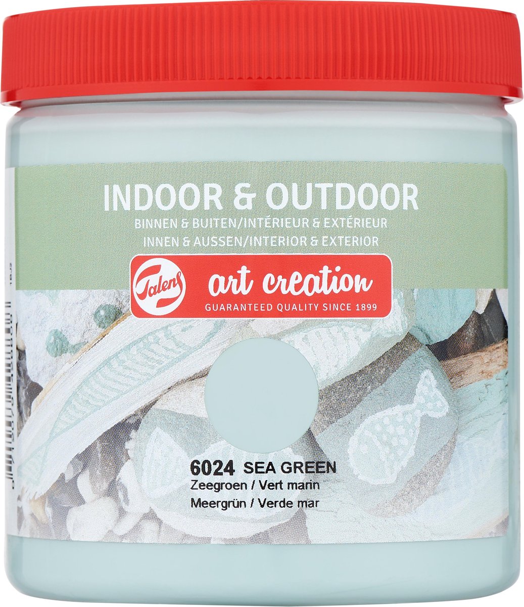 Talens Art Creation Indoor & Outdoor verf is een universele verf met een goede dekkracht, voor zowel gebruik binnenshuis als buitenshuis. Met deze zijdeglansverf kan je bijvoorbeeld ook vogelhuisjes en bloempotten decoreren. Verkrijgbaar in maar liefst 40 kleuren met zowel heldere tinten als vintage kleuren. Na 24 uur droogtijd is de verf waterbestendig en kan het buiten geplaatst worden. Deze flacon bevat 250 ml in de kleur zeegroen. De verf is op waterbasis. Talens Art Creation Creative De nieuwe lijn van Talens Art Creation is ontwikkeld voor de creatieve hobbyist en liefhebber van do-it-yourself. Talens Art Creation biedt uitstekende materialen tegen de best mogelijke prijs. Het Creative assortiment bestaat uit diverse verflijnen zoals Textile, Glass & Porcelain, Indoor & Outdoor verf, Vintage krijtverf, Metallic verf en nog vele andere materialen voor het maken van de mooiste creaties, kunstwerken en decoraties voor in en om huis.