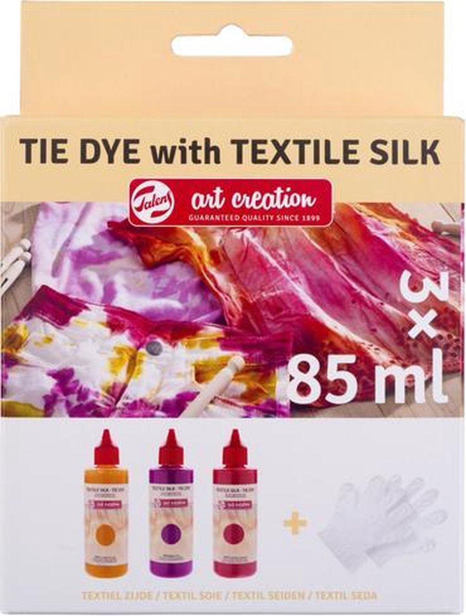 Met Tie Dye kan je jouw kleding aanpassen naar eigen smaak. De Tie Dye set bevat 3 flesjes van 85ml met doseertuit in de kleuren zonnig geel, intens karmijn en moedig roze. De set bevat ook twee handschoenen.