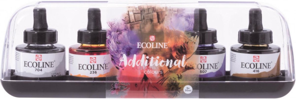 Unieke "Additional" set met vijf ronde flacons 30 ml Ecoline van Talens. De doppen van de nieuwe flacons zijn ook voorzien van een druppelpipet! Als je ooit met Ecoline hebt gewerkt, dan weet je hoe onvoorstelbaar helder en briljant de kleuren zijn. Ecoline wordt voor veel verschillende toepassingen gebruikt zoals handlettering, bullet journaling, illustraties, kalligrafie, modeontwerpen en productdesign. Bij elke toepassing zorgen de briljante kleuren altijd weer voor een levendig resultaat. Ecoline hecht prima op aquarelpapier, tekenpapier en karton. Inhoud: - 5 ronde flacons 30 ml Ecoline met druppelpipet: Grijs (704), Lichtoranje (236), Vermiljoen (311), Ultramarijn violet (507) en Sepia (416).