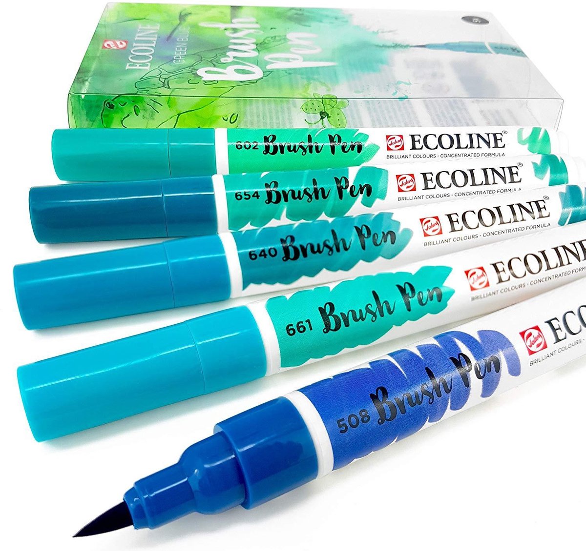 Set met vijf superhandige Ecoline Brush Pennen, deze zijn klaar voor gebruik en ook nog eens geurloos. Je gebruikt de Brush Pen voor dunne precieze lijnen of voor energieke streken, maar ook voor het vullen van grote kleurvlakken. De diverse kleuren zijn bij uitstek geschikt voor oefeningen in het mengen van kleuren. De Ecoline Brush Pens hechten uitstekend op aquarelpapier, tekenpapier en karton. Ze zijn ook ideaal voor onderweg of als je op een plek werkt die schoon moet blijven. Inhoud: 5 Talens Ecoline Brush Pennen: Pruisischblauw (508), Donkergroen (602), Blauwgroen (640), Dennengroen (654) en Turkooisgroen (661). + Basis Boekje Hand & Brushlettering (Studio Suikerzoet) Met de speciale Brush Pen blender kunnen kleuren worden gemengd of getemd. Ook kun je er prachtige verwassingen en kleurovergangen mee maken. Vergeten de dop terug te plaatsen? Een ingedroogde brush-tip is makkelijk te redden door deze met wat water vochtig te maken.???+ 1 x A4 Ecoline/aquarelblok.