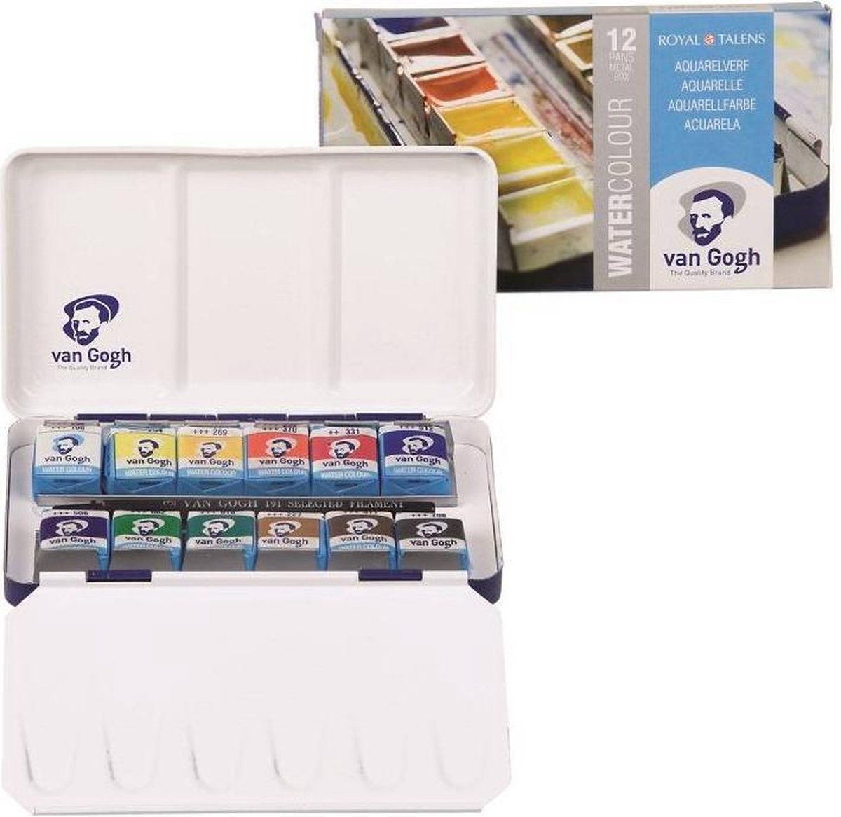 Van Gogh Aquarelverf. Set in handig metalen blik. Inhoud: 12 kleuren napjes, sponsje en rond filament penseel.