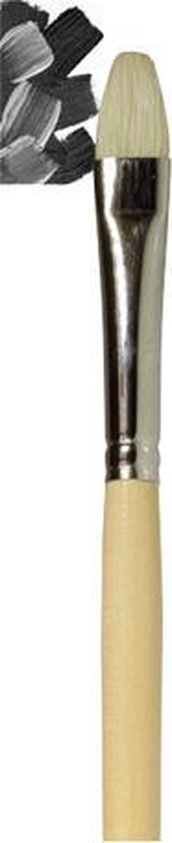 Serie: 208 Haar: gebleekt Chinees varkenshaar Vorm: kattentong Huls: afgeplat, naadloos vernikkeld messing Steel: lang, transparant gelakt Karakteristieken: • slijtvaste en veerkrachtige haarbundel • kan veel dikke verf bevatten • voor het schilderen van afgeronde strakke toetsen