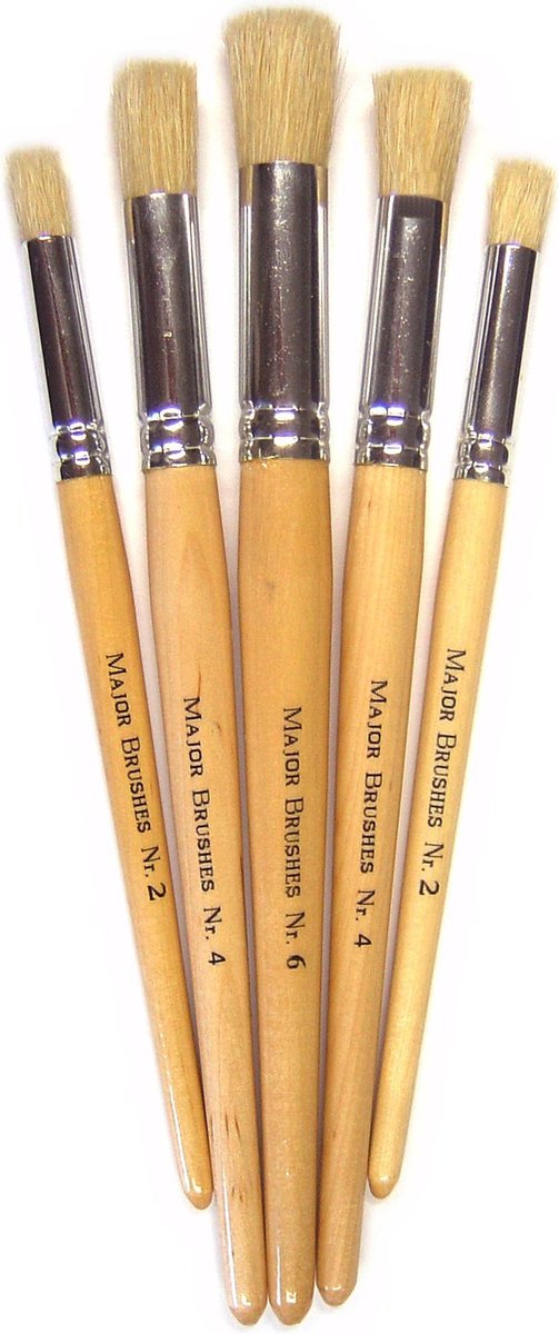 Handige 10-delige sjabloonkwasten set gemaakt van kort wit varkenshaar ideaal om te gebruiken bij verf sjablonen. De haarbundel is speciaal rond en kort specifiek voor te tamponeren. De totale lengte is tussen 19 en 23 cm. Deze set bestaat uit 4 x Nr.2 + 4 x Nr.4 + 2 x Nr.6.